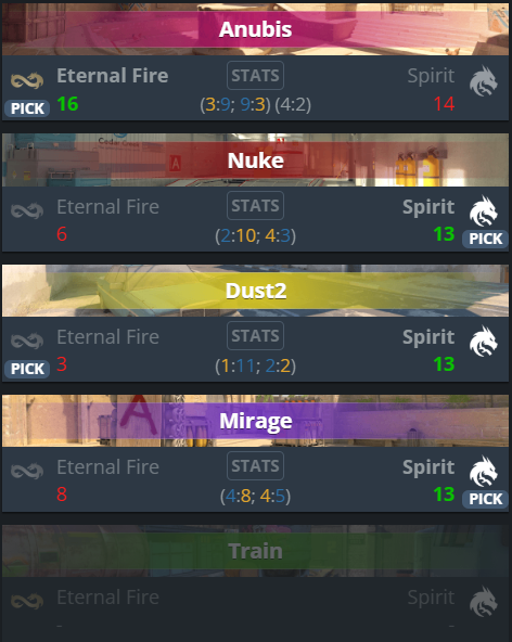 As Eternal Fire doesn’t seem to be consistent and Spirit is clearly a more consistent here both as a team and their players, together with the past results between these two it makes Spirit the clear favorite here. We expect Spirit to win this match.