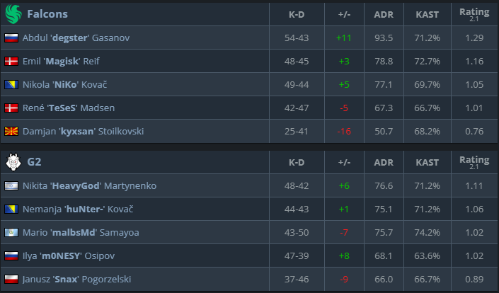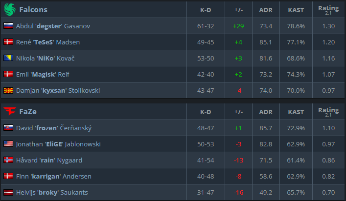 ‘degster’ showed incredible form in a semi-final match against FaZe, and he had a rating of 1.30 by the end of the game, carrying his team to victory. ‘NiKo’ and ‘TeSeS’ also seem to be in good form at this tournament, and overall, they seem to rely less on the star potential of ‘NiKo’ and rather on a whole team playing well together.