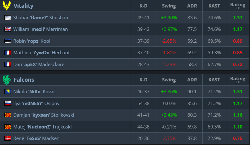 m0NESY has been outstanding with a tournament rating of 1.36, while NiKo follows closely at 1.27, making them the two highest-rated players of the event and the driving force behind Falcons’ run toward their first trophy of the year.