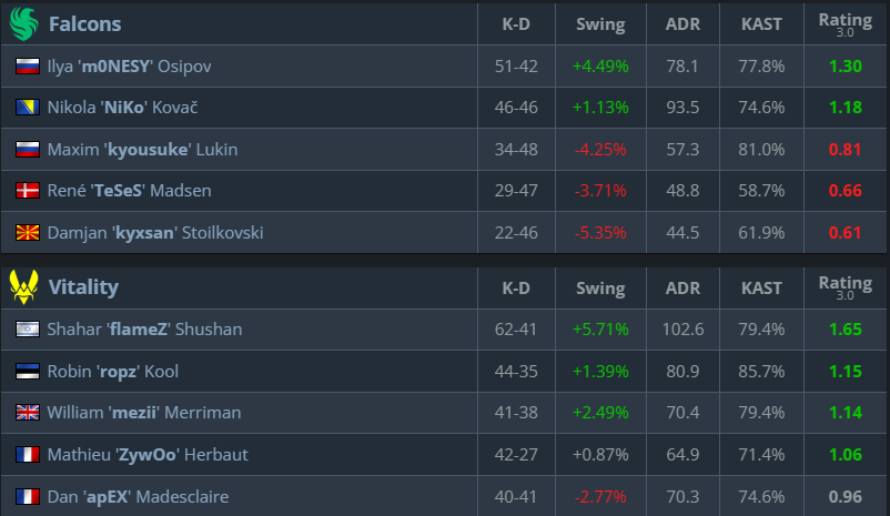 Falcons enter the semi-finals without dropping a single match, and once again it’s m0NESY leading the show. With a tournament rating of 1.33, he is currently the best-performing player at the event.
