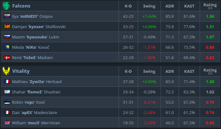 m0NESY continues to dominate the tournament, holding an extraordinary 1.51 rating and once again finishing as his team’s top fragger in the semi-final. His consistency in high-pressure matches has been crucial for Falcons.