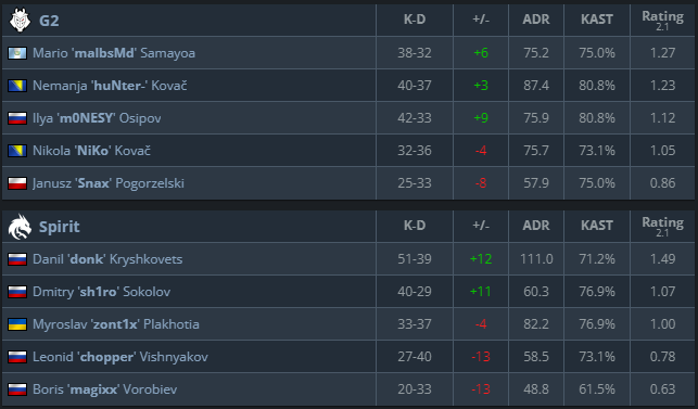 Mostly, it was three players that were leading the scoreboards for Spirit, it was ‘donk’, ‘zont1x’, and ‘sh1ro’, but in their semi-final match, their in-game leader ‘chopper’ showed us what he is capable of in a good day. He was the number one on the scoreboard for his team, carrying both as a player and as an in-game leader. They’re in great form but have yet to prove their ability to keep it consistent since they had problems with being consistent before.
