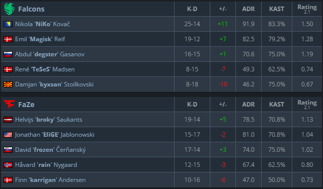 Falcons lost only one match against paiN in a group stage, and other than that, they were comfortable with other opponents. In their quarter-final match, they had to play against Eternal Fire, and even though last time Eternal Fire won the match between them, this quarter-final was different. Falcons showed what they’ve learned and took down Eternal Fire with a score of 2-1. The semi-final was Falcons being underdogs against FaZe, who was a clear favorite to win the tournament, but against the odds, they won against FaZe with a confident score of 2-0 and got their Grand Final spot.