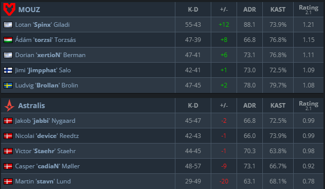 They recently changed their in-game leader ‘siuhy’ for ‘Spinx’, and ‘Brollan’ became an in-game leader. It is a big change for the team, but it seems to work out so far. At the start, ‘Spinx’ wasn’t doing what he was capable of, as we all know. Still, in the semi-final match against Astralis, when it matters the most, ‘Spinx’ was completely dominating the game and ended up with having a rating of 1.21, being the leader of the scoreboard. ‘torszi’ seemed to be in a great shape as well. It is essential to have a sniper who can hit his shots.