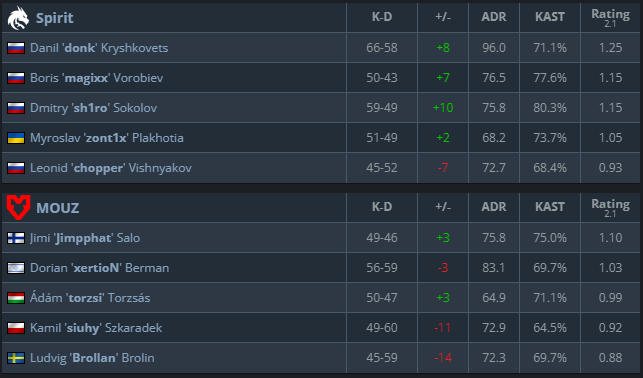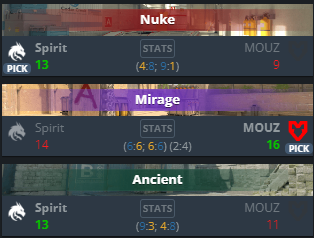Even though MOUZ did a great job in their recent matches, Spirit seems to be a better team overall, and especially when it comes to players, ‘donk ‘seems to continue dominating his opponents. We expect Spirit to win this match.