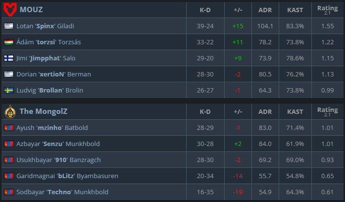 As for their players, ‘torszi’, ‘Spinx’, and ‘Jimpphat’ had the best performance and seem to be in great shape. In their hardest match against Falcons, all the MOUZ players had a positive rating by the end of the match, meaning the team worked together well, and everyone was in good form.