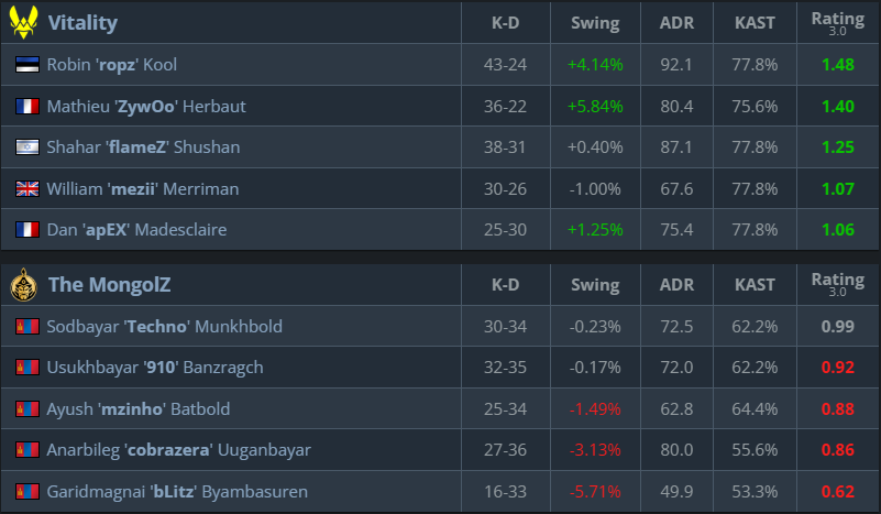 In their semi-final win over TheMongolZ, ropz led in frags, with strong support from ZywOo and flameZ.