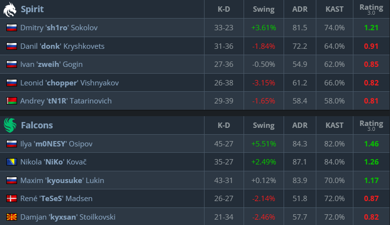 Spirit has looked stronger than ever since their recent roster adjustments. Their success continues to center around donk, who is again proving why he is considered one of the best riflers in the world. He is currently the highest-rated player at the tournament with a rating of 1.73.
