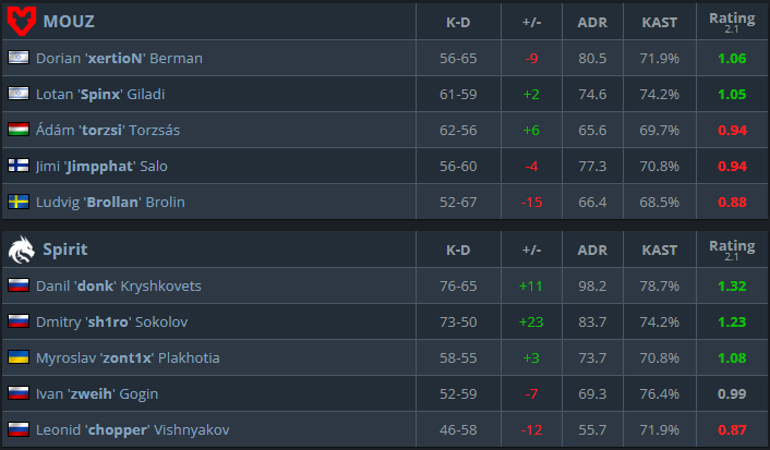 Same as most of the matches throughout the year, their star sniper ‘torszi’ was one of the best fraggers in the game against Vitality, but other than him, it was ‘xertioN’ who ended up as the leader of the scoreboard and showed an incredible form. Every MOUZ player had a positive rating while playing against the best team in the world, which shows that they’re in good form and ready to fight for the trophy.