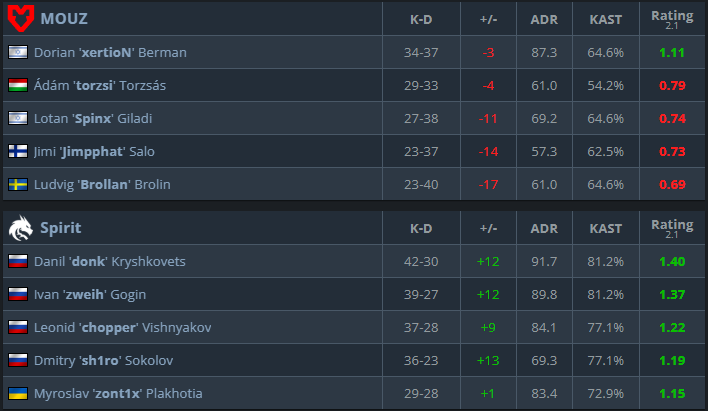 In the semi-final match against MOUZ, everyone on Spirit was playing out of their mind to get the victory, and not a single player ended up having anything close to a negative rating. This time, it was not the duo of ‘donk’ and ‘sh1ro’ leading the scoreboards; it was ‘donk’ and their young recent addition ‘zweih’ as the second-best performer for the team. They’re in great form and seem to be ready to take the second trophy home.