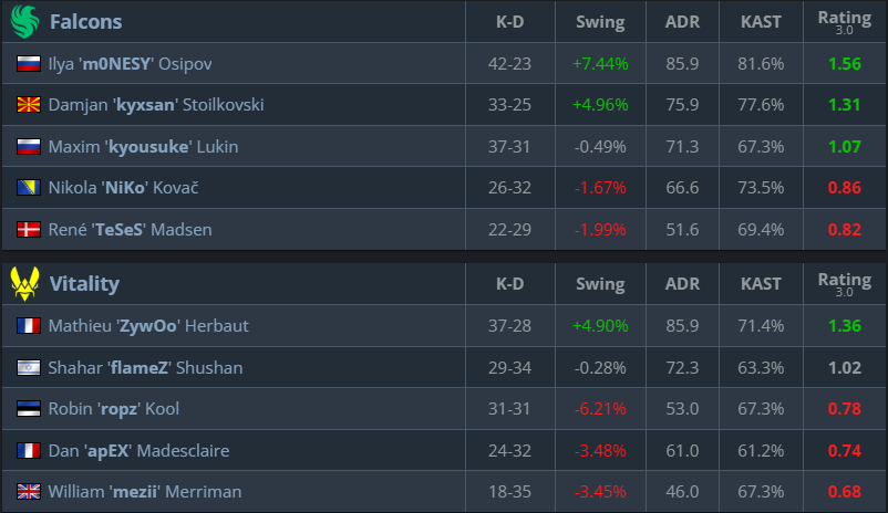 m0NESY has been the standout player of the tournament so far, posting an incredible 1.61 rating and completely carrying Falcons against Liquid. NiKo followed closely behind, proving once again that he can deliver under pressure.