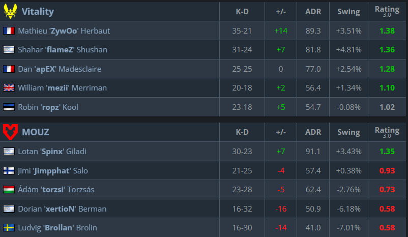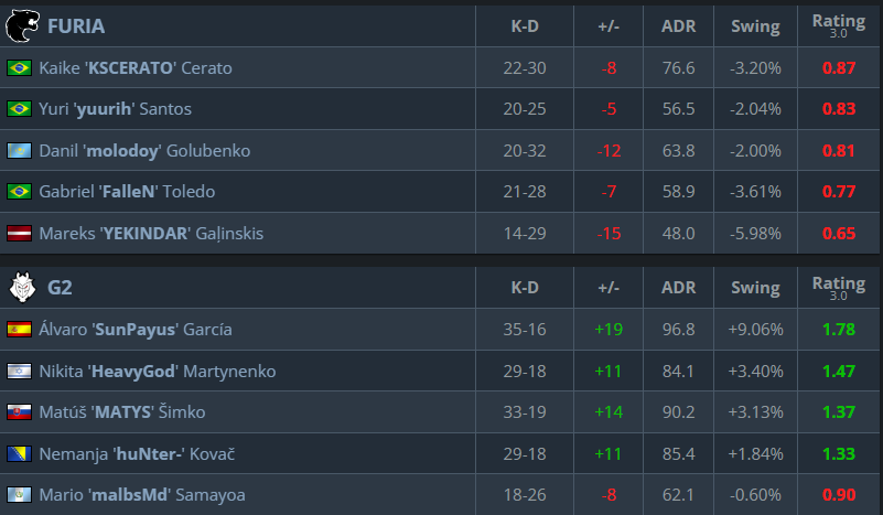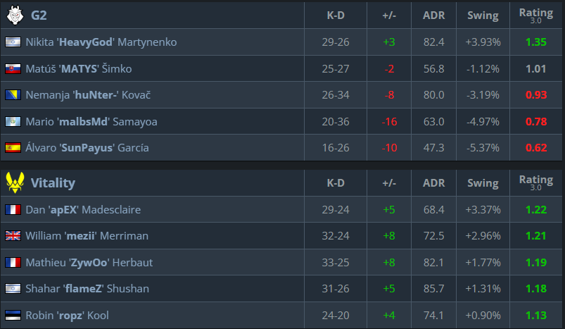 Running hot at this tournament from the start, taking down Spirit and FaZe on their way and completely dominating FURIA in the semi-final, where ‘SunPayus’ left no chance for their opponents and showed his best performance. ‘HeavyGod’ is consistent at bringing a lot of fragging impact, and this time it was also their in-game leader ‘huNter-’ who had the same amount of frags. ‘MATYS’ seems to get better and more confident with each and every game, and this team looks better than it did for a long time after losing ‘NiKo’ and ‘m0NESY’, but the real test will be here at the finals.