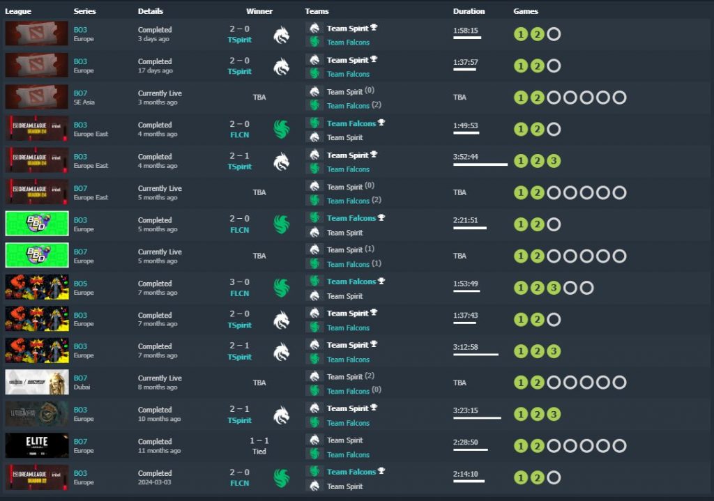 Prior to this clash, the two Dota 2 teams met a total of 14 times. If we also include Spirit’s latest victory, the EEU team has 6 victories, whereas Team Falcons defeated them 4 times. The two Dota 2 teams also have 5 draws between them.