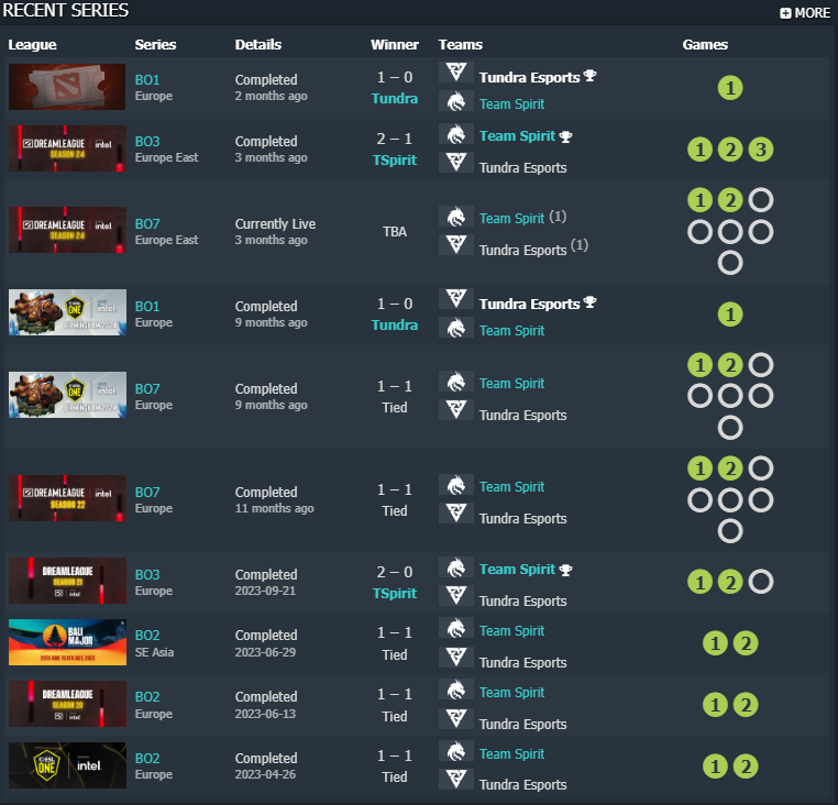 To make a better Tundra Esports vs Team Spirit prediction, we must dive deep into the two teams’ previous games. Courtesy of DotaBuff, we can see that the two met more than 10 times. What’s interesting is that, in their last 10 games, both teams only have 2 wins. All other series ended in a draw. Speaking of series, there has only been one Bo3 clash, and Team Spirit won it.
