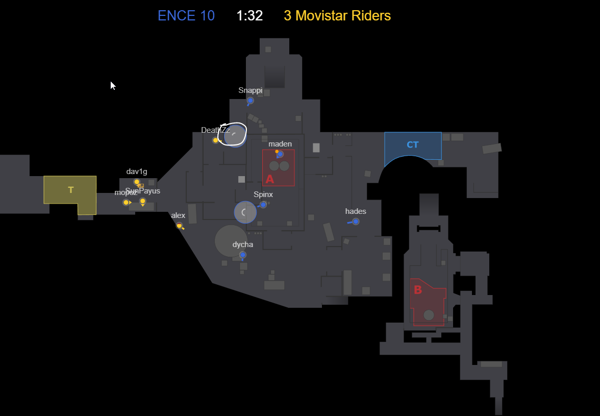 Understanding the movement pattern of Snappi, ENCE’s ramp player, might help out to punish him on early timings. Marco likes to play right behind the smoke between 1:40 and 1:35, it could be abused a couple of times during the map.