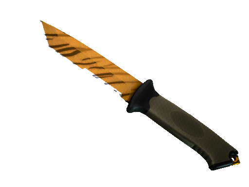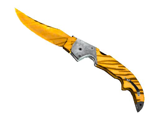 The Falchion Knife | Tiger Tooth in CS2 boasts a curved, golden blade decorated with bold black tiger stripes that shimmer under light. Its distinct sweeping shape and polished finish give it a striking, exotic look that perfectly balances style and aggression.