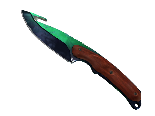 The Gut Knife | Gamma Doppler in CS2 showcases a vibrant green and black blade with a mesmerizing, marble-like gradient pattern that shifts with the light. Its unique gut hook and glossy finish give it a bold, futuristic appearance that stands out in any loadout.