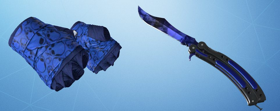 One more hand wraps in the collection, but this time with a butterfly knife. The gloves reinforce Doppler’s dominant blue tones, making it look really cool in-game. We advise buying the wraps in Minimal-Wear condition, and the knife in Factory-New or Minimal-Wear condition, as the price gap is about $200.