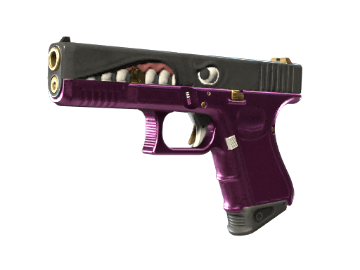 The Glock-18 | Gold Toof features a playful design with a luxurious touch. It showcases a custom paint job, a pink grip, and an aggressive, forward-facing gaze.