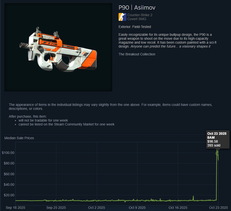 For example, you can check the average price of the P90 | Asiimov (Field-Tested) on the Steam Market as of October 23, 2025.