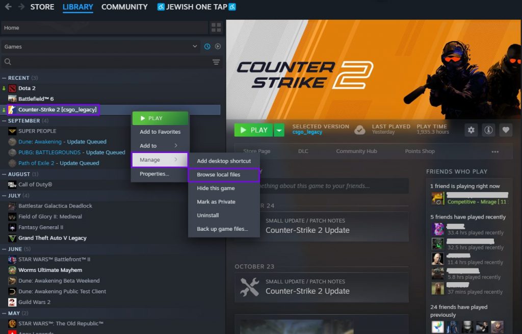 - Find csgo.exe (Steam Library→ Counter-Strike 2 (right-click) → Manage → Browse local files)