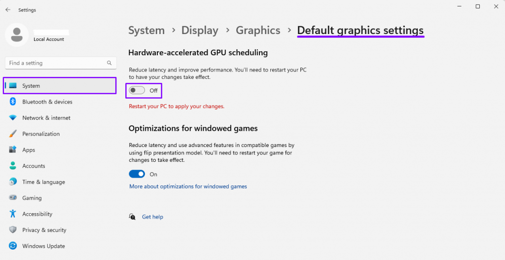 Follow the next path: Windows Settings → System → Display → Graphics → Default Graphics Settings