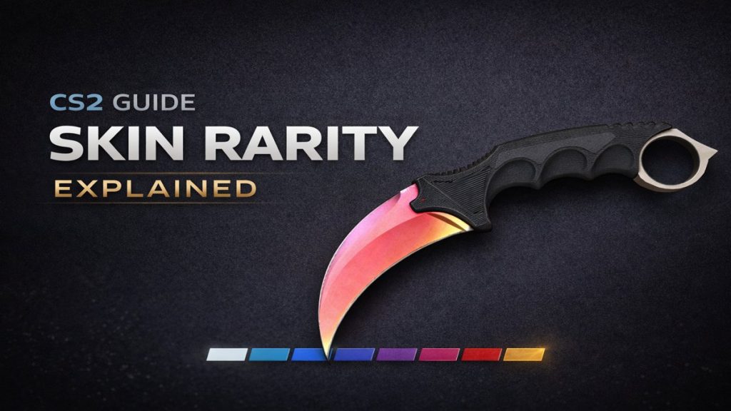 This guide explains the CS2 rarity tiers in order, shows the case drop odds by rarity (including the separate Special Item roll for knives and gloves), and clarifies how rarity differs from wear/float, StatTrak, Souvenir skins, stickers, agents, and Trade Up Contracts—so you can read a skin’s tier correctly and avoid confusing “rare” with “valuable.”