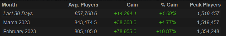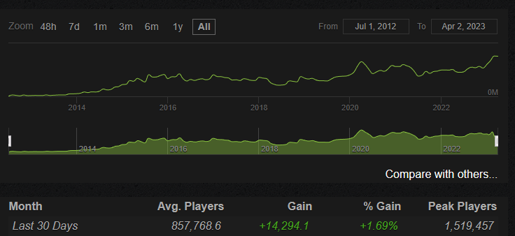 Those records were rewritten only three years later: peak players count record was updated in February 2023, and from that moment it has been already broken several times for the last 2 months; average players record was just broken a couple of hours ago.