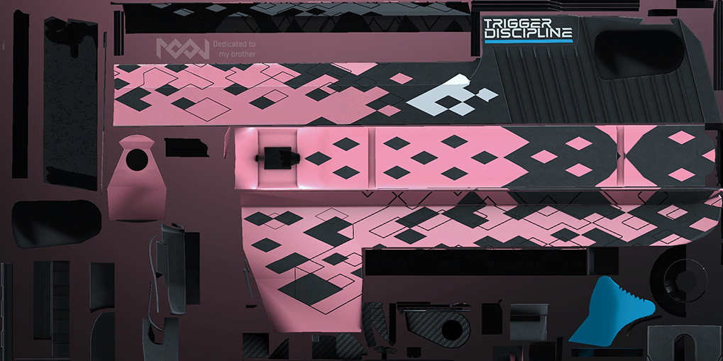 Although it’s unnoticeable in-game, The Trigger Discipline’s texture pattern shows a ‘Dedicated to my brother’ text which is a message from ‘moonfighter’ to his brother.