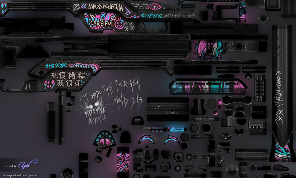 ‘I hope that I crash and die’, ‘Never Sorry’, ‘Pain’ and even ‘4:20’ and ‘ACAB’ can be noticed in the pattern template of the skin. But the major difference is the Chinese writing located on the back side of the weapon.