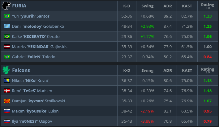On the other side of the server stands FURIA, a team combining veteran leadership with rising talent. KSCERATO and molodoy have been carrying the torch for the Brazilians, both sitting comfortably in the top three players of the tournament, just behind m0NESY.