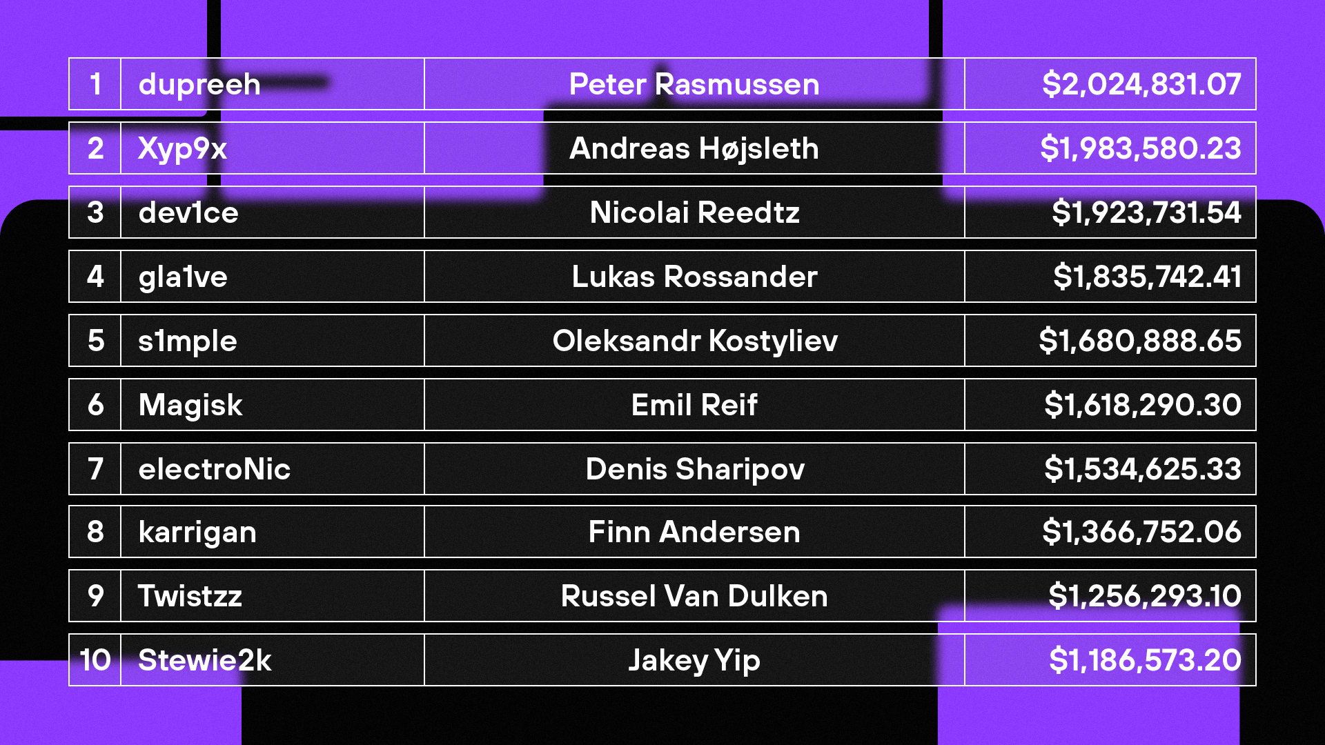 Peter “dupreeh” Rasmussen, with more than $2 million, leads the rating of the richest CS:GO players. His ex-teammates from Astralis, Nicolai “dev1ce” Reedtz, Andreas “Xyp9x” Højsleth, and Lukas “gla1ve” Rossander, claimed the next 3 positions. The only non-Astralis player in the top 5 is Oleksandr “s1mple” Kostyliev, with almost $1,7 million.