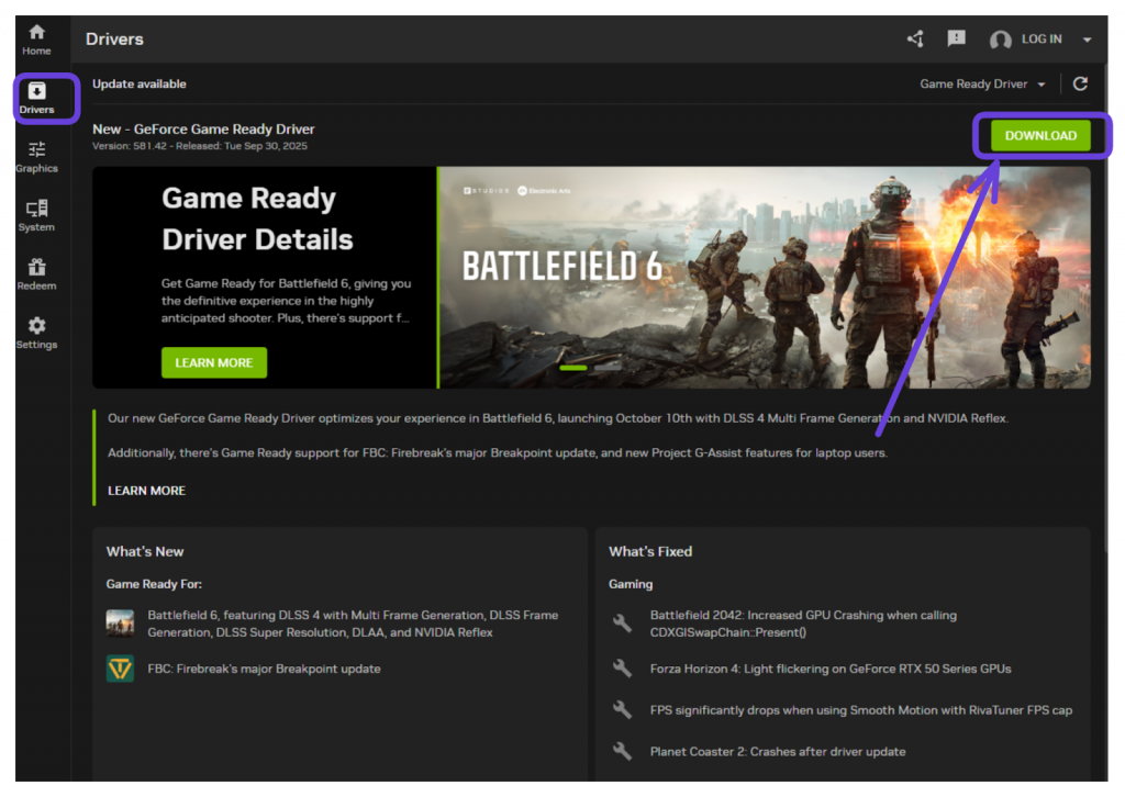 - NVIDIA: Use the NVIDIA App to install the latest Game Ready driver.