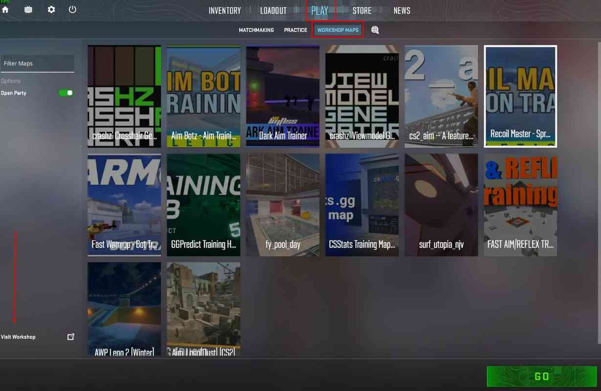 - Launch CS2 and select Workshop Maps from the drop-down menu.