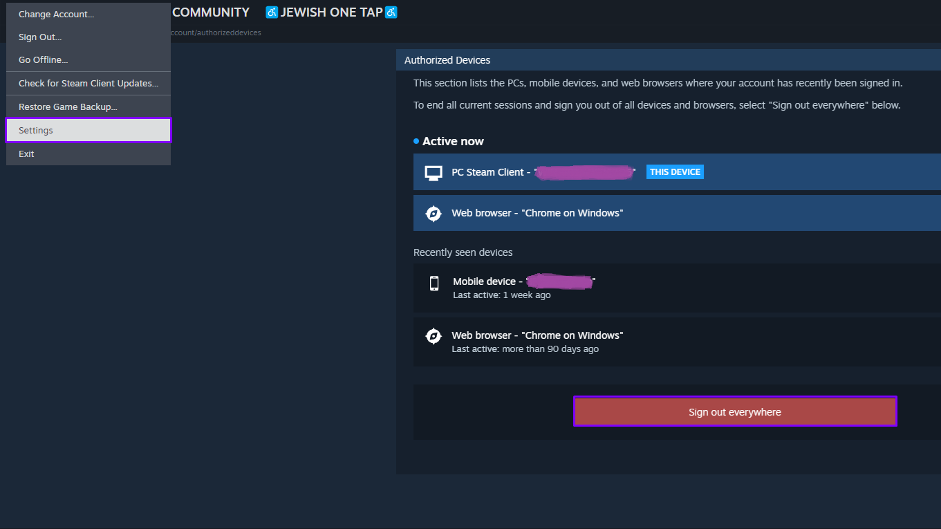 Steam > Settings > Security & Devices > Deauthorize all other devices