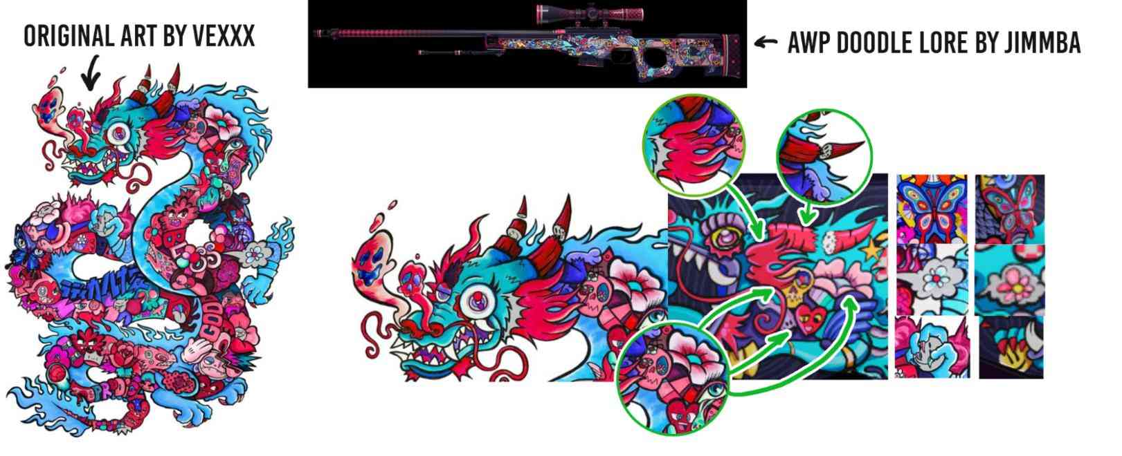 Image of the original artwork VS the skin from DanidemUnexpectedly, the conversation steered onto another skin which was even worse than the M4A4 Howl. The AWP Doodle Lore was simply stolen without any major changes to the design and finding the original artwork wasn’t that hard since the artist was featured in multiple interviews around the internet.