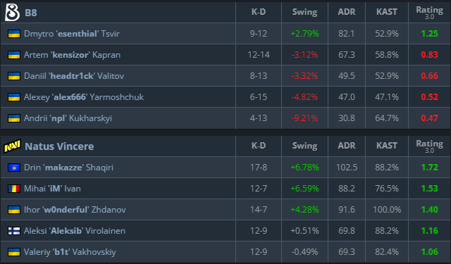 NAVI powered ahead to an 8-2 lead, suffocating B8’s attempts to gain map control. Although B8 managed to take the final two rounds of the half, NAVI immediately shut the door in the second pistol. Aleksi “Aleksib” Virolainen delivered a momentum-crushing triple kill in the post-plant, teeing up a clean 5–0 finish to close the map comfortably.