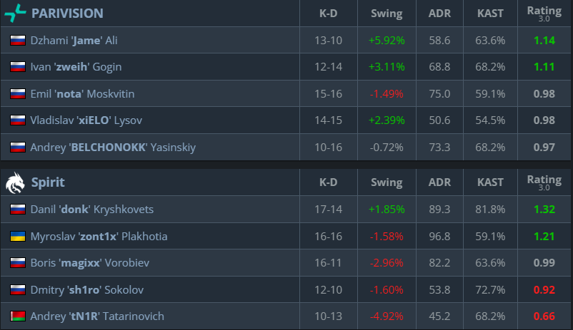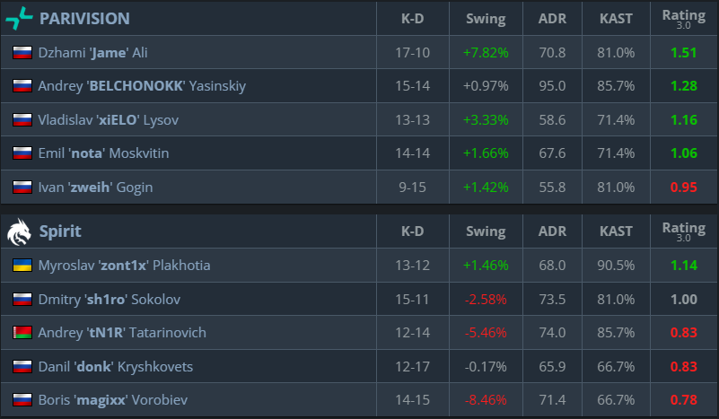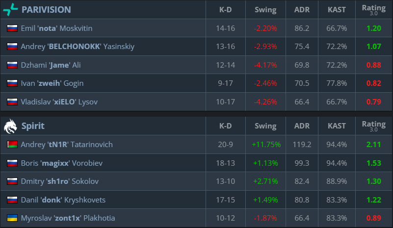 In the second half, even after losing the pistol round, PARIVISION kept their defense strong. BELCHONOKK stood out with a great rating and high-impact plays, helping the team win key rounds. PARIVISION finished the map 13-8 to win the series and shock Spirit.