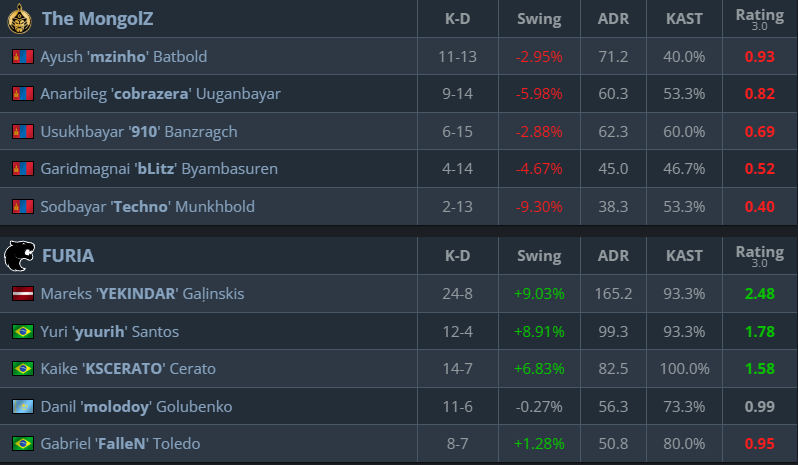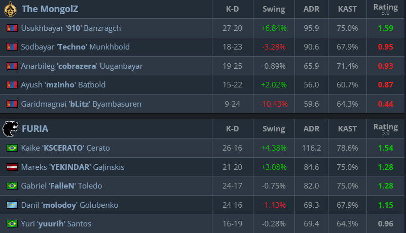 Inferno was a tense map. TheMongolZ reached several match points and nearly closed out the series, but FURIA’s clutch rounds, including a standout 1v5 by Gabriel “FalleN” Toledo late in the game, kept them in it and forced overtime. In overtime, FURIA pulled ahead.