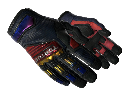 The Specialist Gloves | Marble Fade showcase a vibrant mix of red, blue, and yellow tones with a smooth, reflective finish reminiscent of the iconic Marble Fade knife pattern. The palms and fingertips feature dark protective padding, creating a sharp contrast that highlights the colorful upper layer. These gloves stand out for their flashy, high-end look and are a favorite among players who love bold, eye-catching cosmetics.