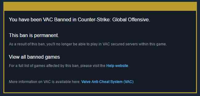 Valve’s Anti Cheat Software operates in various ways. It scans the running processes on your computer for cheats and checks for any code injection into the game during launch. Additionally, it monitors any alterations made to the game’s files and any readings or writings in the game memory, a common tactic cheats use. The software also maintains a library of cheats already known to Valve, which are automatically “detected”. If you’re found running a detected cheat, you will almost instantly be banned from playing on any VAC Secured servers, including official servers. Moreover, VAC Bans will prevent you from accessing third-party platforms for CS2. Finally, VAC Bans will be displayed on your profile as VAC Bans.