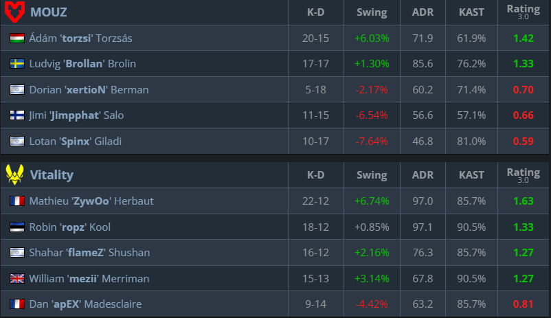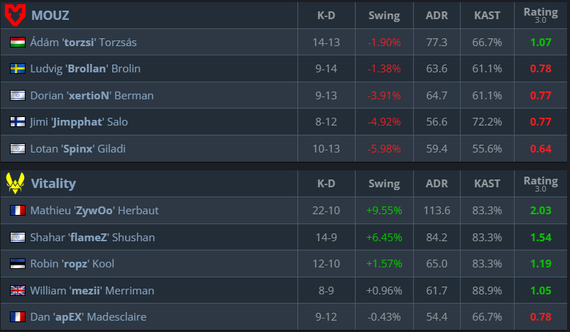 Even though torzsi had some big plays, MOUZ struggled as a team and were outmatched by Vitality’s teamwork and firepower.