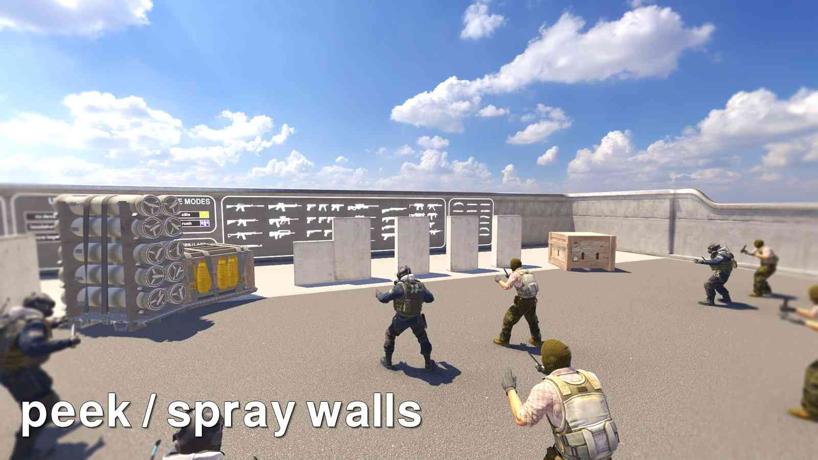 * Terrain options: uneven ground and various peek/spray wall options.