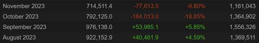 The graph shows a clear sag in the players’ online starting September 2023. Various annoying bugs and other technical issues have caused significant changes, dropping more than 180,000 players during October and November.
