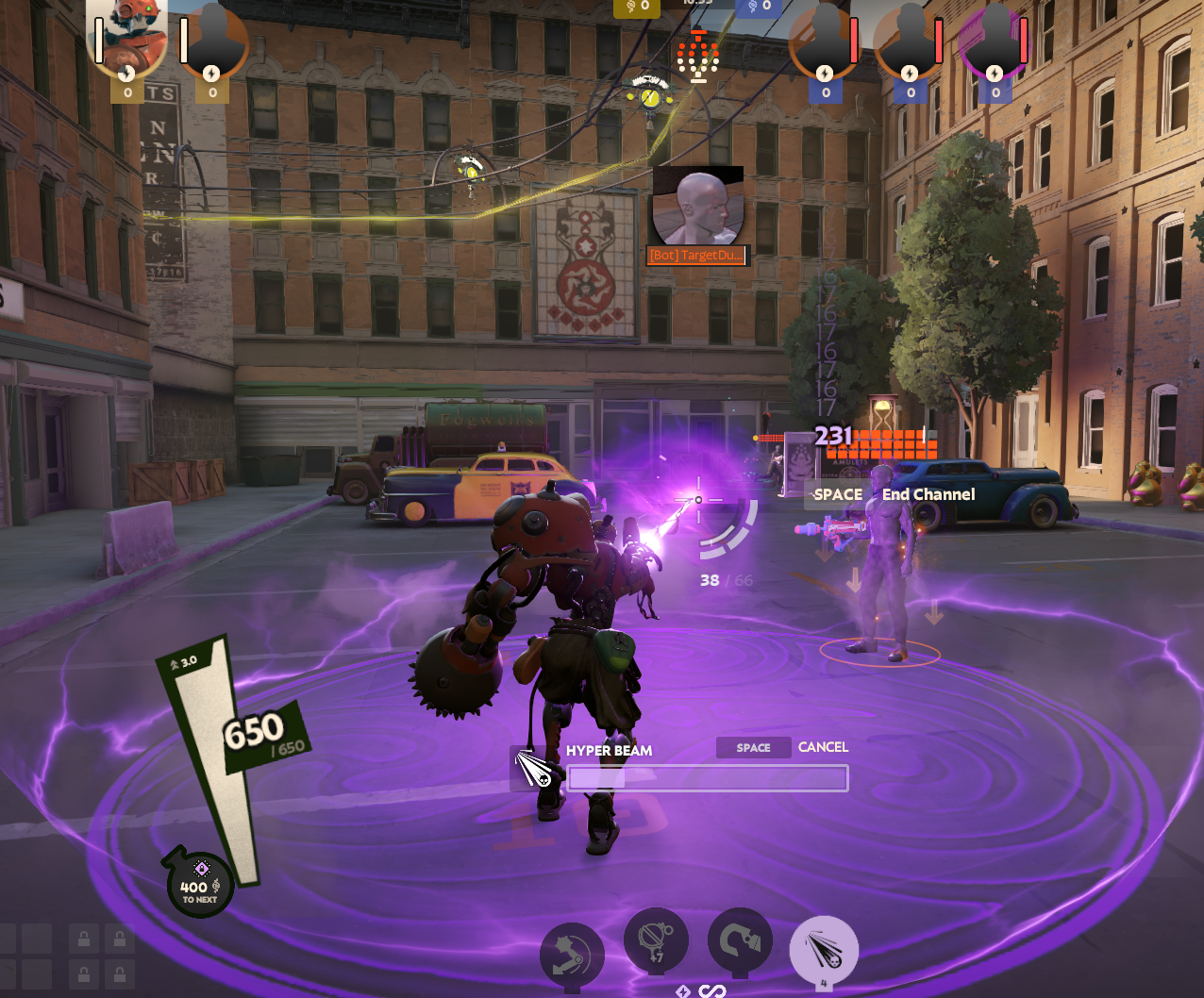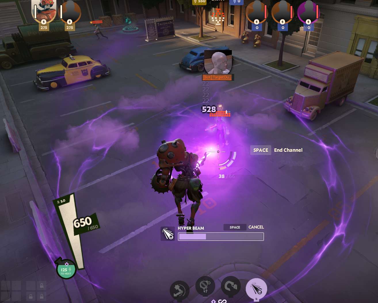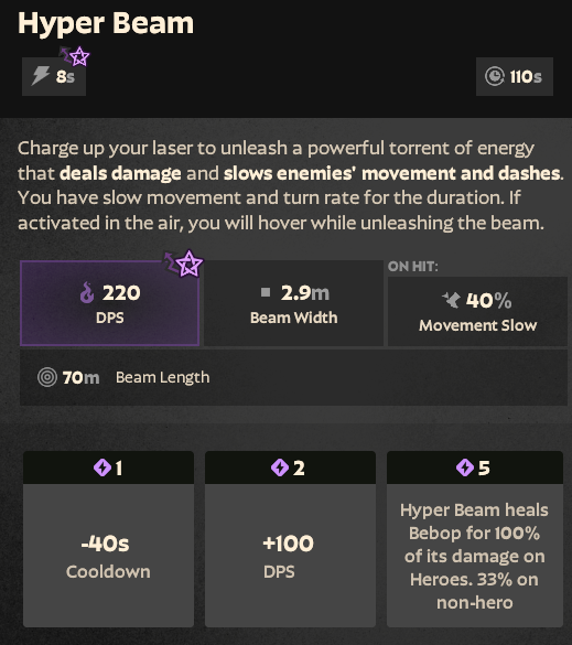 Bebop’s movement speed and turning speed are significantly reduced while using the Ultimate ability. However, opponents who get close to us while Hyper Beam is active will also take damage from it.