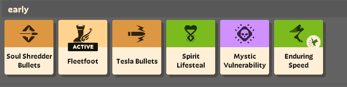 The last three items in the early game are Spirit Lifesteal, Mystic Vulnerability, and Endring Speed.