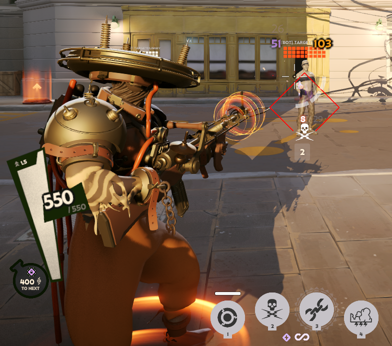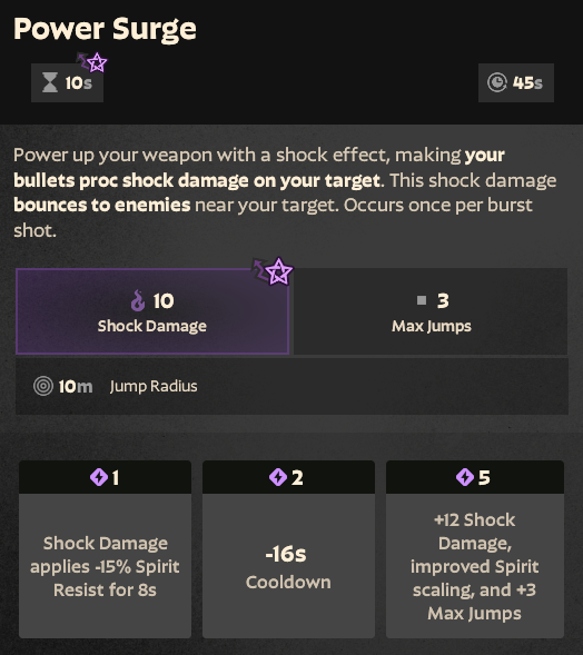 Power Surge enables bullets to inflict shock damage. During this ability, the shock effect from the bullets spreads to nearby targets, allowing Seven to deal massive AOE damage.