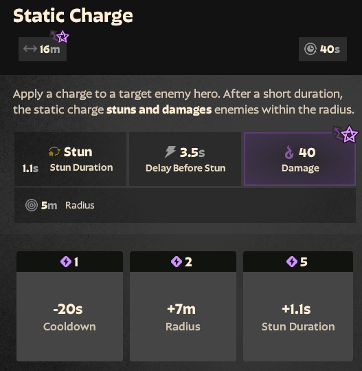This ability applies a static charge to the enemy, which then explodes after a few seconds, stunning the enemy and causing damage to nearby targets.