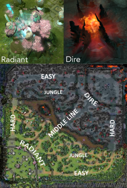 Dota has three lanes and five players to distribute. In general, it always turns into 2-1-2, and the lanes are divided into a hardlane (aka offlane), a midlane, and an easy lane (safe lane).