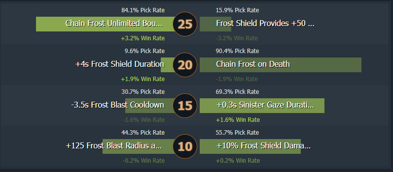 In terms of the Lich Dota 2 Facet, Frostbound has an 81.43% presence and a 55.06% win rate. Growing Cold, on the other hand, comes with an 18.57% presence and a 54.43% win rate.